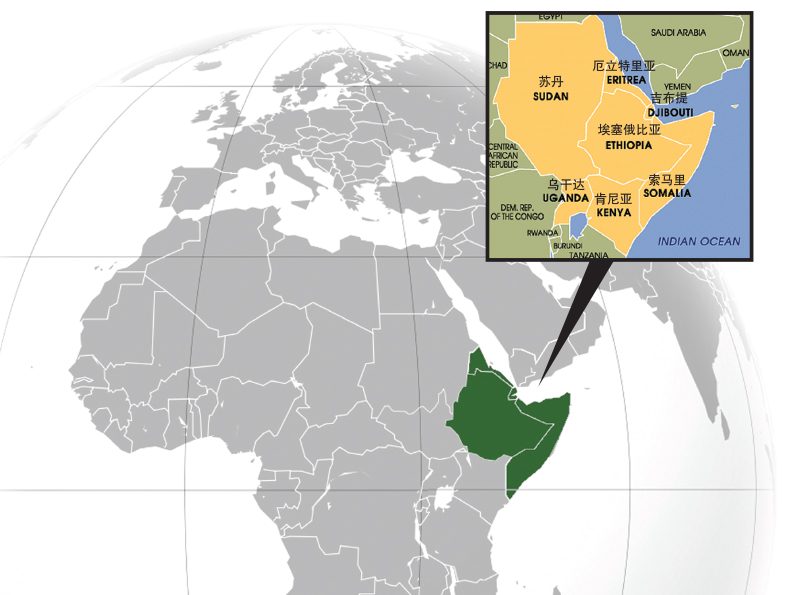 非洲之角位于非洲东部,包括吉布提(Djibouti)、厄立特里亚(Eritrea)、埃塞俄比亚(Ethiopia)、肯尼亚(Kenya)、索马里(Somalia)、南苏丹(South Sudan)、苏丹(Sudan)和乌干达(Uganda)八个国家。这片地区呈犀牛角状,向东伸入阿拉伯海(Arabian Sea),并因此而得名非洲之角。