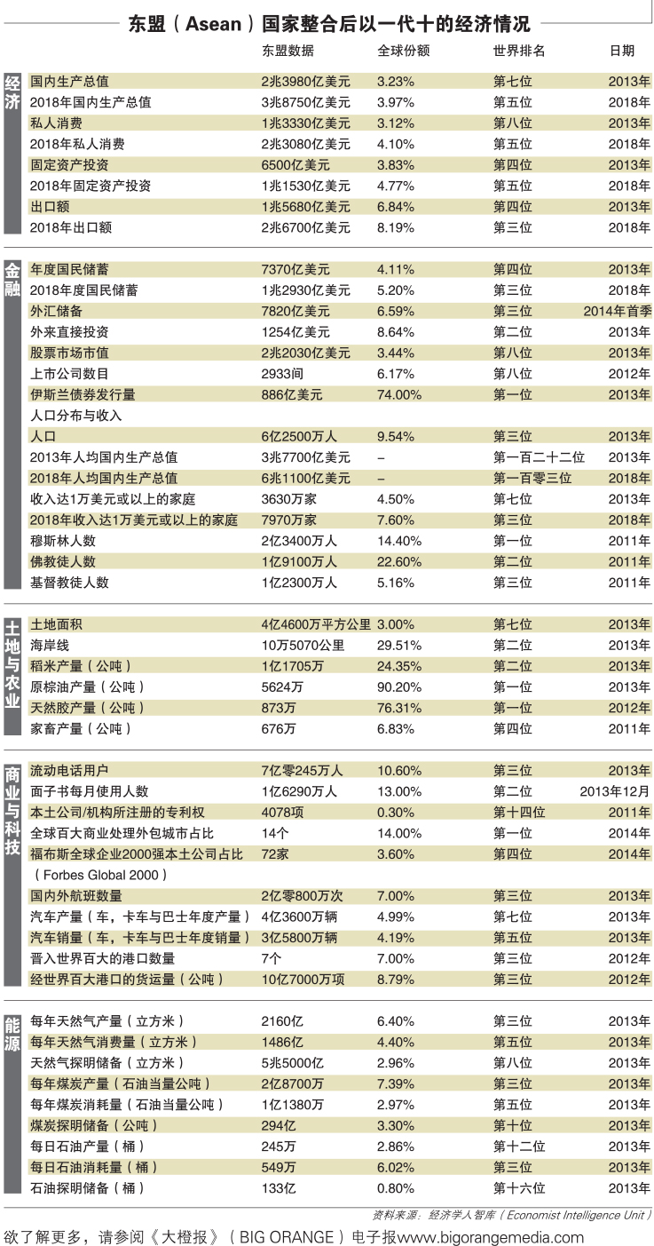 东盟区域占有世界人口的近10%,并被列为第七大经济体。直至2018年,它将成为世界第五大经济体,归功于强劲的经济成长。整体来说,经济学人智库(Economist Intelligence Unit)预计东盟在未来5年的年度成长均值将达到5.6%。实际上,东盟的成长率仅稍低于印度(India)和中国(China),但显著超越巴西(Brazil)以及俄罗斯(Russia)等其他新兴市场。